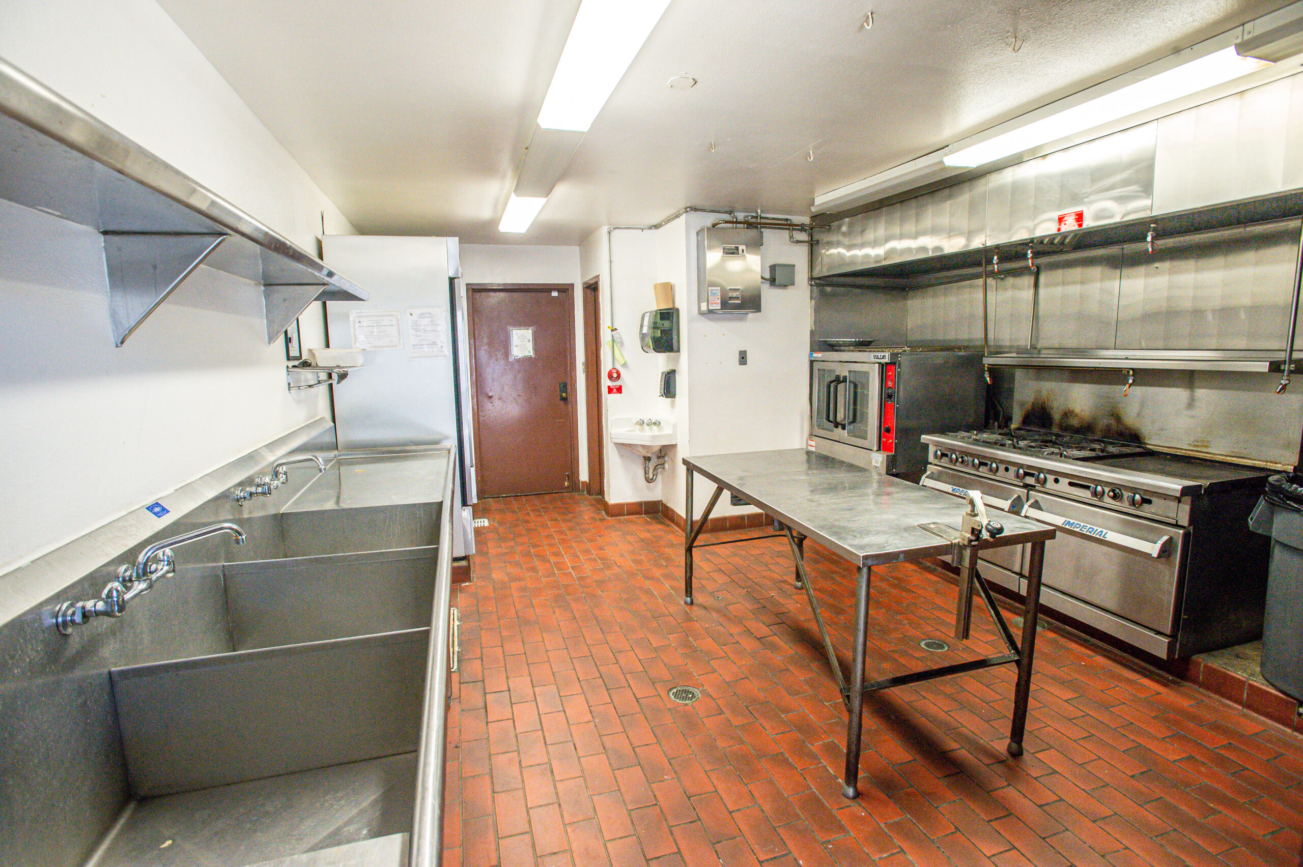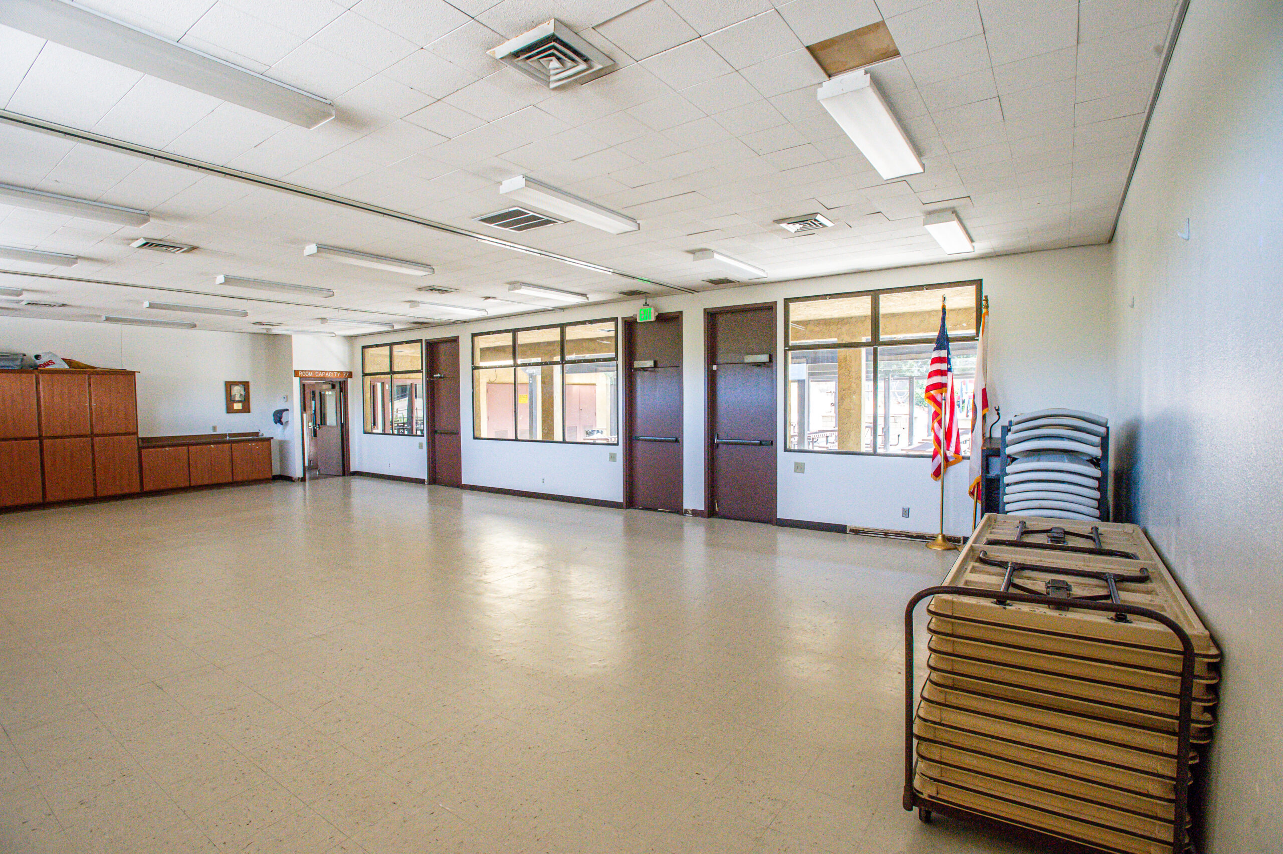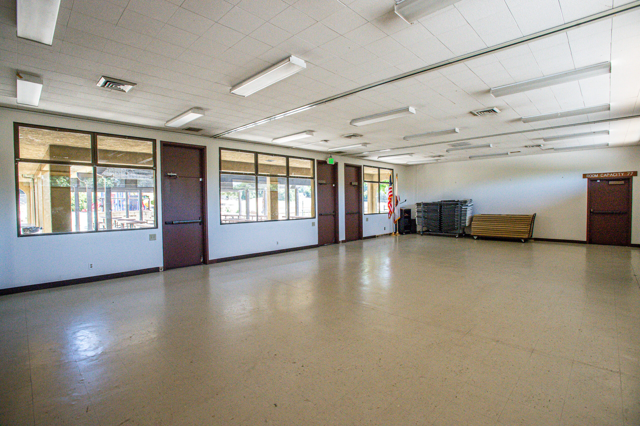Then Main Hall can be reserved for basketball or special events. The smaller room, known as the Kunkle Room, can be reserved for meetings or special events. The Kunkle Room reservation also includes use of the outdoor patio. There is a full kitchen that is available for rent which is a separate rental from the room reservations, and it first comes, first reserved. Each facility comes with access to rectangular tables and metal chairs for use at your event.